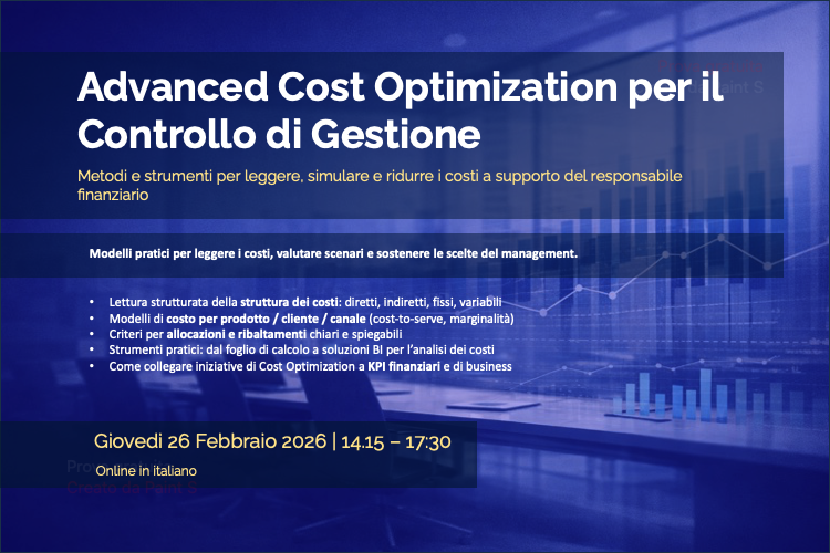 Projlink.net, con il patrocinio di Assocontroller, organizza un workshop dedicato ai metodi e agli strumenti di Cost Optimization, con particolare attenzione alla lettura strutturata della struttura dei costi, alla definizione di criteri di allocazione chiari e difendibili e alla costruzione di viste di costo e marginalitร  per prodotto, cliente e canale a supporto del responsabile finanziario.